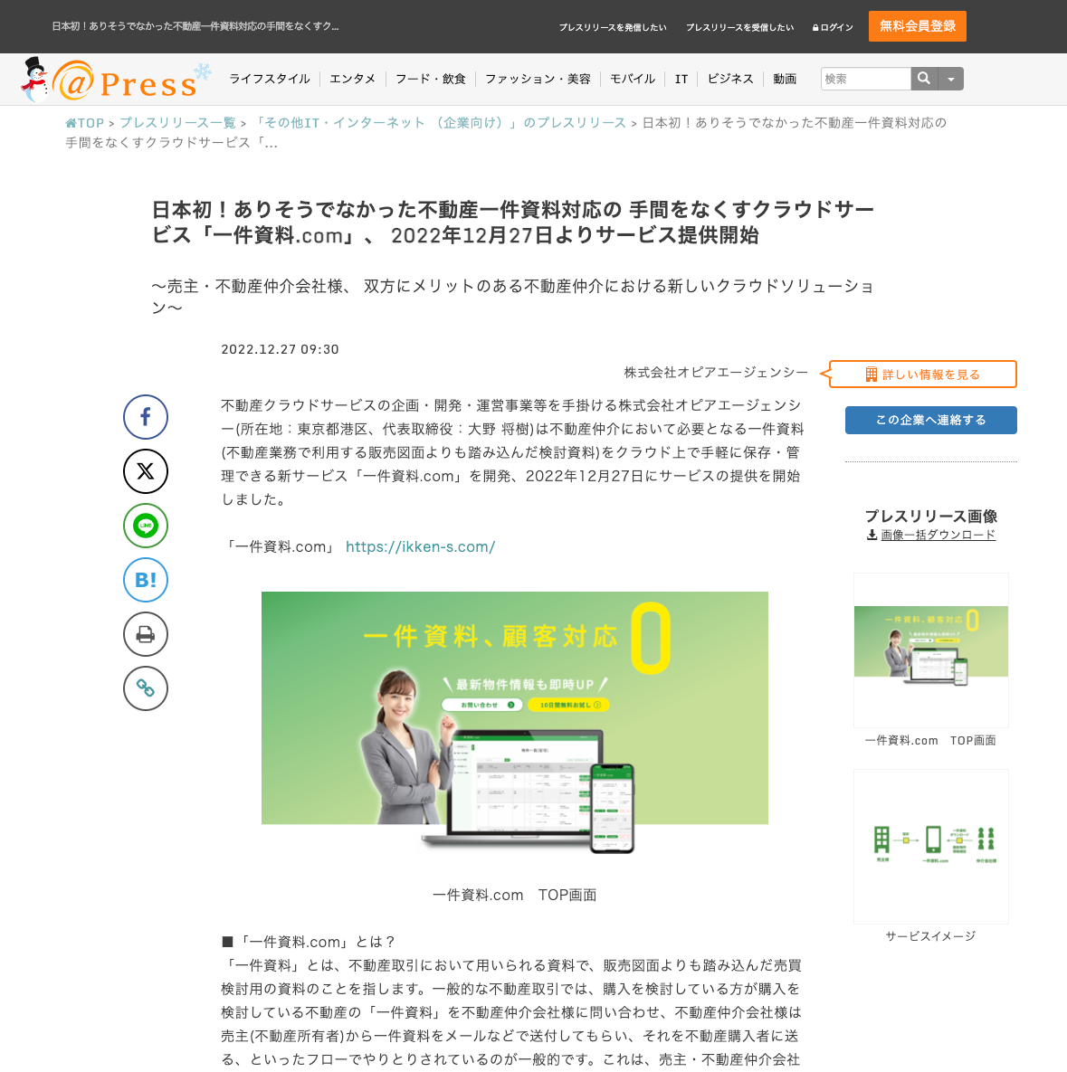 一件資料.comを@Press(アットプレス)様で掲載いただきました。